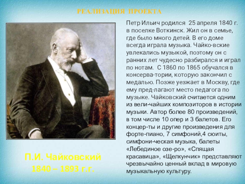 в поселке Воткинск. Жил он в семье, где было много детей. В его доме всегда играла музыка. Чайко-вские увлекались музыкой, поэтому он с ранних лет чудесно разбирался и играл по нотам. С 1860 по 1865 обучался в консерва-тории, которую закончил с медалью. Позже уезжает в Москву, где ему пред-лагают место педагога по музыке. Чайковский считается одним из вели-чайших композиторов в истории музыки. Автор более 80 произведений, в том числе 10 опер и 3 балетов. Его концер-ты и другие произведения для форте-пиано, 7 симфоний,4 сюиты, симфони-ческая музыка, балеты «Лебединое озе-ро», «Спящая красавица», «Щелкунчик» представляют чрезвычайно ценный вклад в мировую музыкальную культуру.