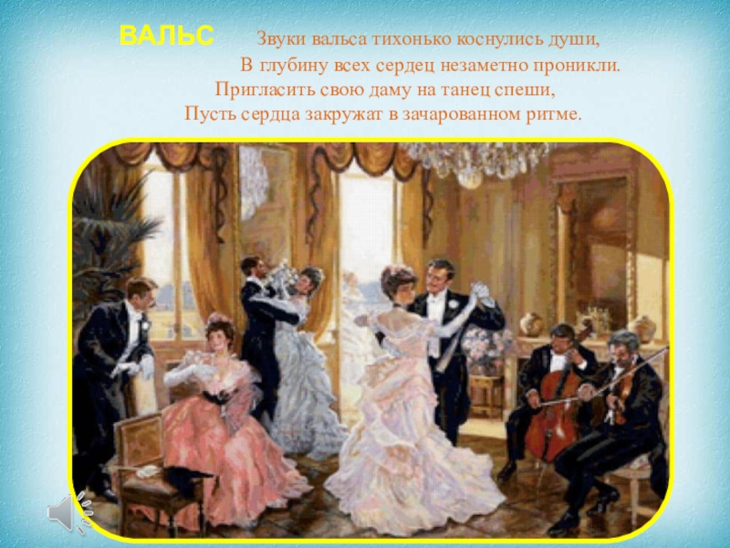 Слайд 14ВАЛЬС Звуки вальса тихонько коснулись души,