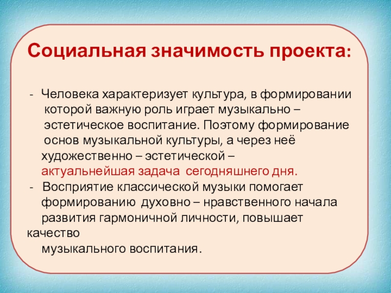 Проект направлен на формирование начал музыкальнo-художеcтвеннoй культуры,