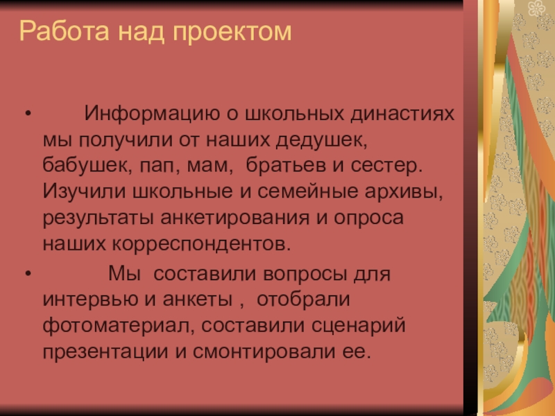 Мы составили вопросы для интервью и анкеты , отобрали фотоматериал, составили сценарий презентации и смонтировали ее.