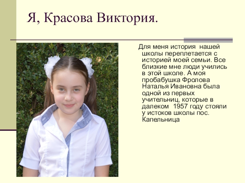 историей моей семьи. Все близкие мне люди учились в этой школе. А моя пробабушка Фролова Наталья Ивановна была одной из первых учительниц, которые в далеком 1957 году стояли у истоков школы пос. Капельница
