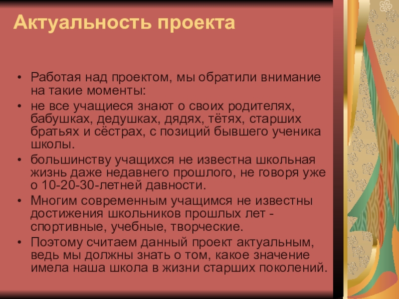 Поэтому считаем данный проект актуальным, ведь мы должны знать о том, какое значение имела наша школа в жизни старших поколений.