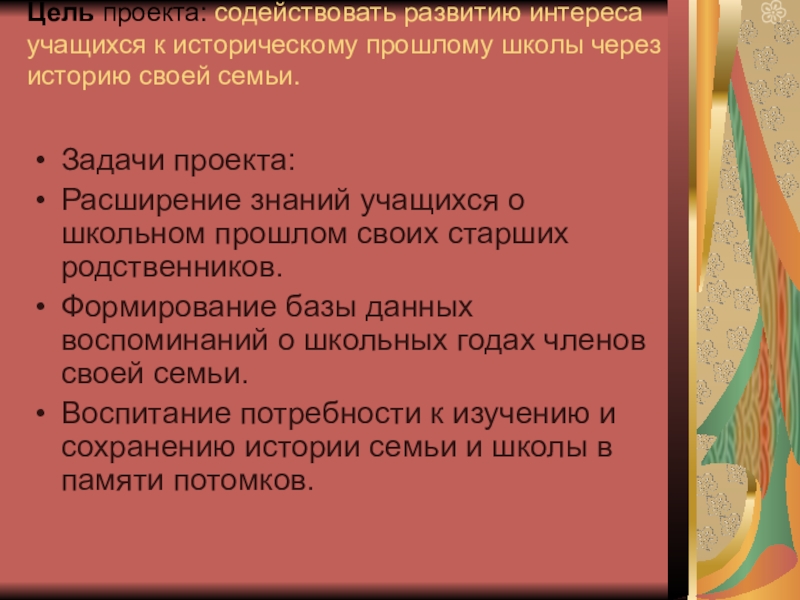 Слайд 3Цель проекта: содействовать развитию интереса учащихся к историческому прошлому школы через историю