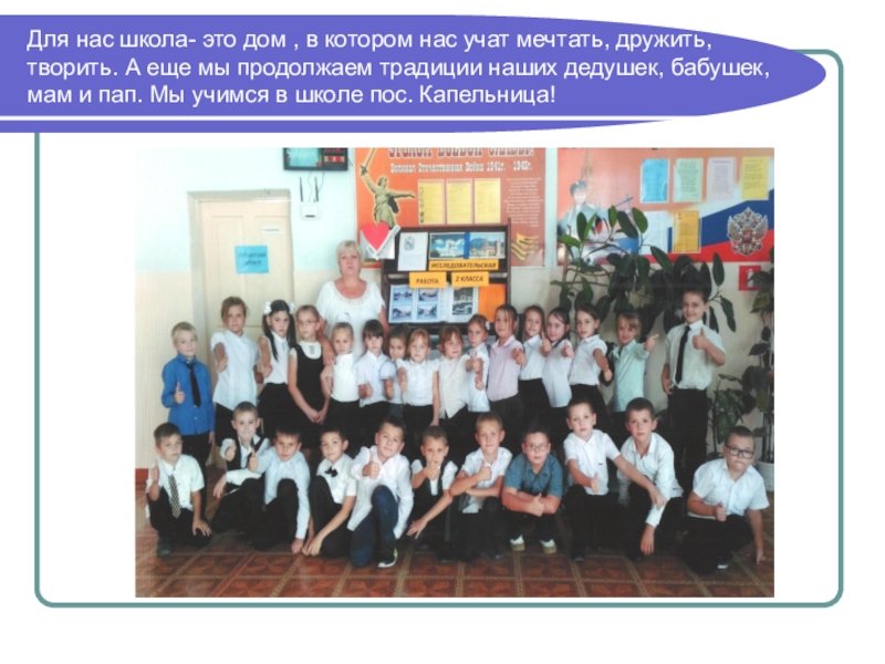 дружить, творить. А еще мы продолжаем традиции наших дедушек, бабушек, мам и пап. Мы учимся в школе пос. Капельница!