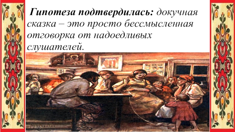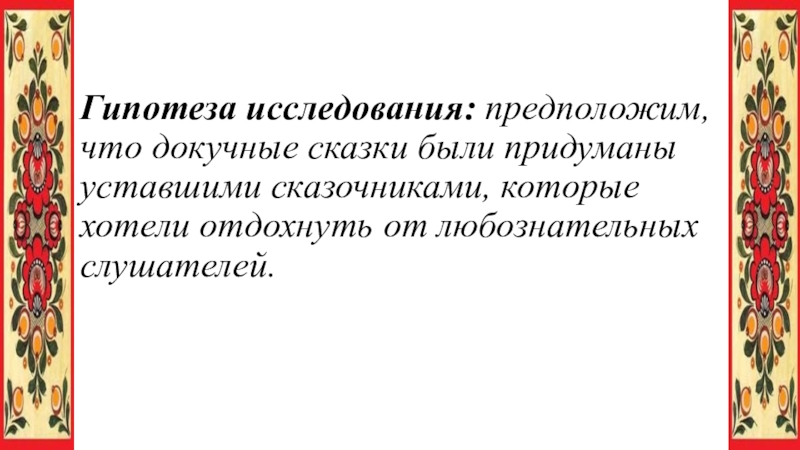 Слайд 3Гипотеза исследования: предположим, что докучные сказки были придуманы уставшими сказочниками, которые