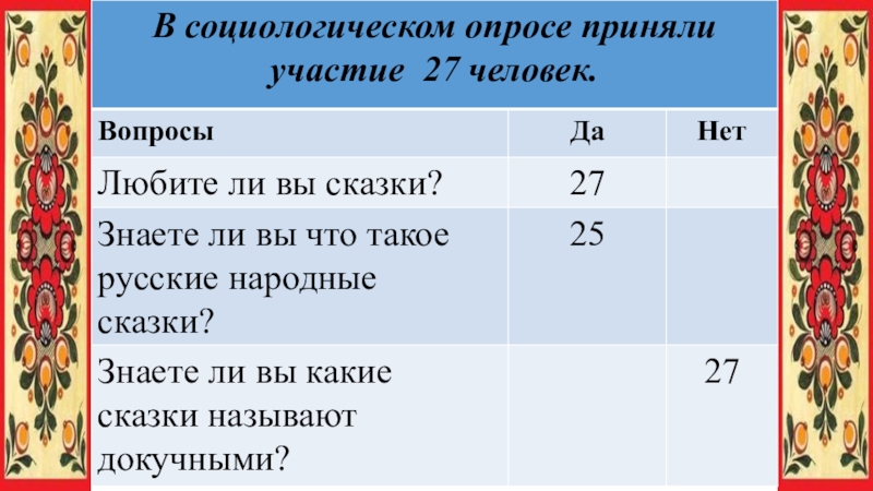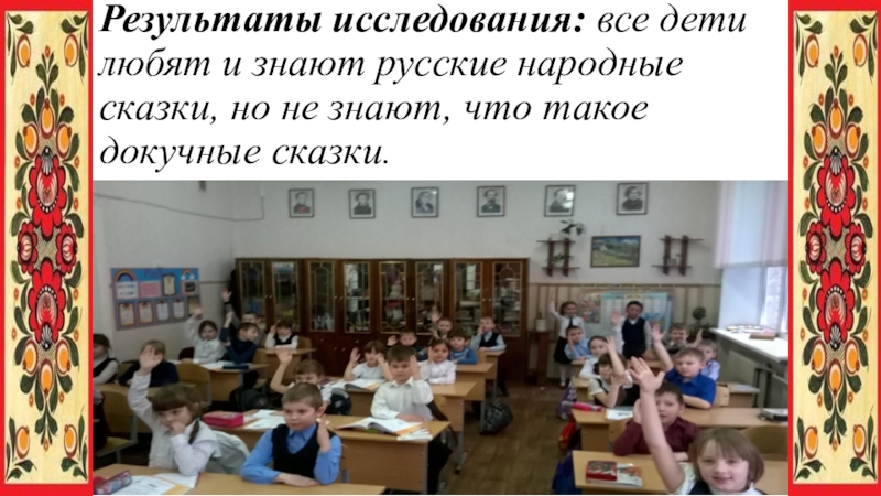 Слайд 7Результаты исследования: все дети любят и знают русские народные сказки, но