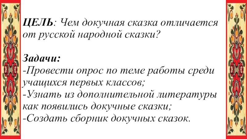 Слайд 2 ЦЕЛЬ: Чем докучная сказка отличается от русской народной сказки? Задачи: -Провести опрос