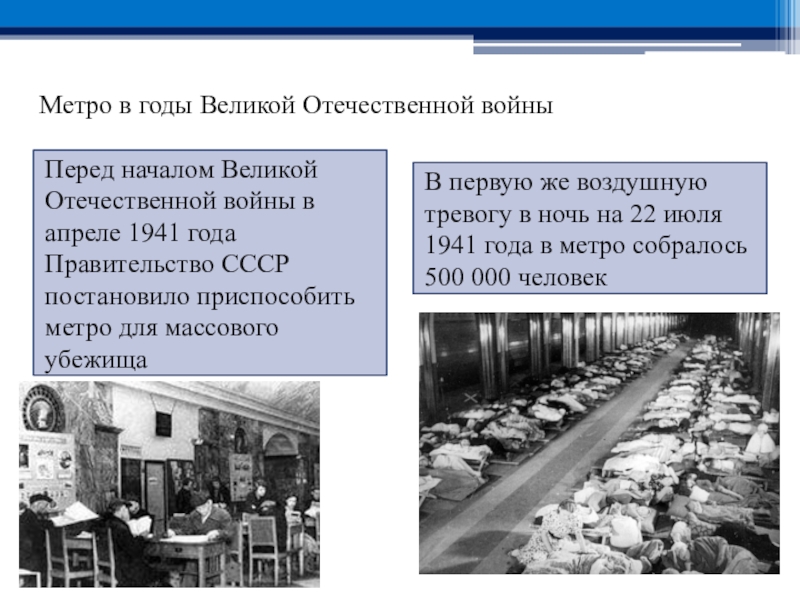 В первую же воздушную тревогу в ночь на 22 июля 1941 года в метро собралось 500 000 человек