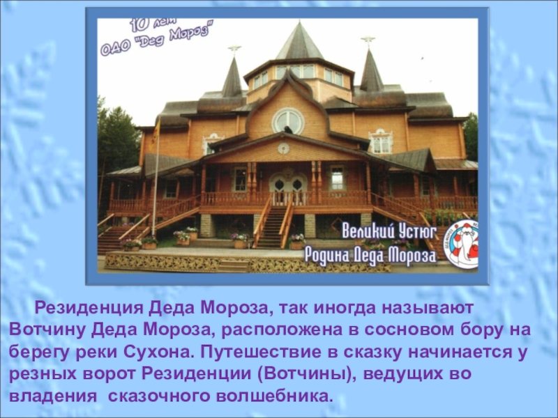 Слайд 9 Резиденция Деда Мороза, так иногда называют Вотчину Деда Мороза, расположена