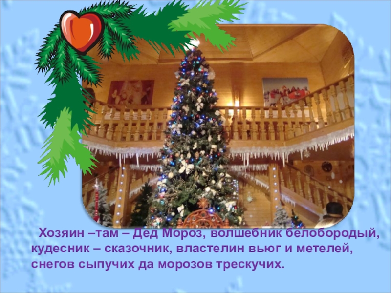 Хозяин –там – Дед Мороз, волшебник белобородый,кудесник – сказочник, властелин вьюг и метелей,снегов сыпучих да морозов