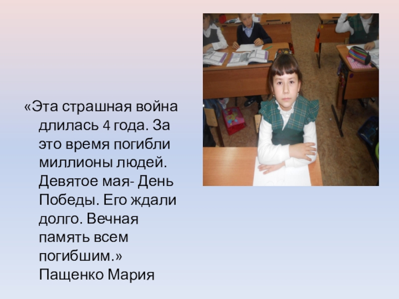 «Эта страшная война длилась 4 года. За это время погибли миллионы людей. Девятое мая- День Победы. Его