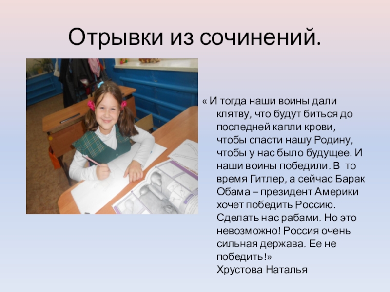 биться до последней капли крови, чтобы спасти нашу Родину, чтобы у нас было будущее. И наши воины победили. В то время Гитлер, а сейчас Барак Обама – президент Америки хочет победить Россию. Сделать нас рабами. Но это невозможно! Россия очень сильная держава. Ее не победить!» Хрустова Наталья