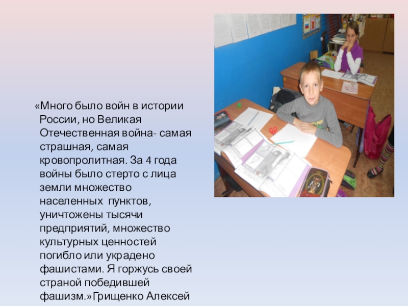 война- самая страшная, самая кровопролитная. За 4 года войны было стерто с лица земли множество населенных пунктов, уничтожены тысячи предприятий, множество культурных ценностей погибло или украдено фашистами. Я горжусь своей страной победившей фашизм.»Грищенко Алексей