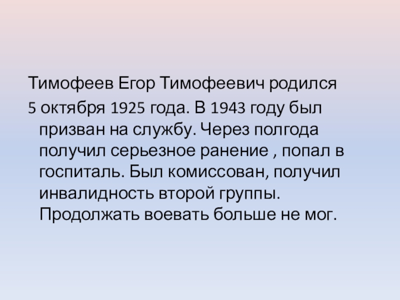 Тимофеев Егор Тимофеевич родился 5 октября 1925 года. В 1943 году был призван на службу. Через