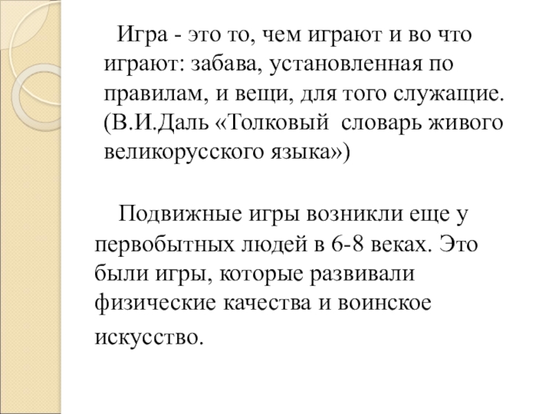 Игра - это то, чем играют и во что играют: забава, установленная по правилам, и вещи, для того служащие. (В.И.Даль «Толковый словарь живого великорусского языка»)