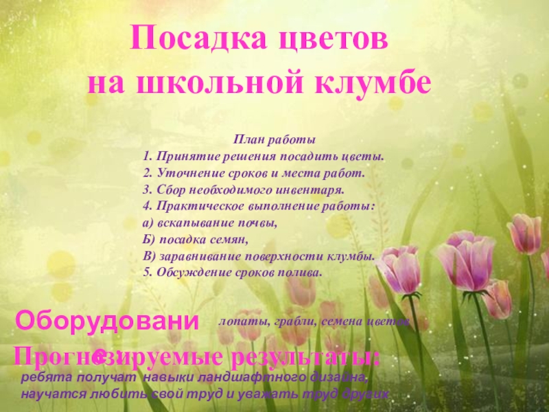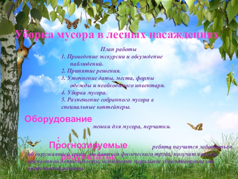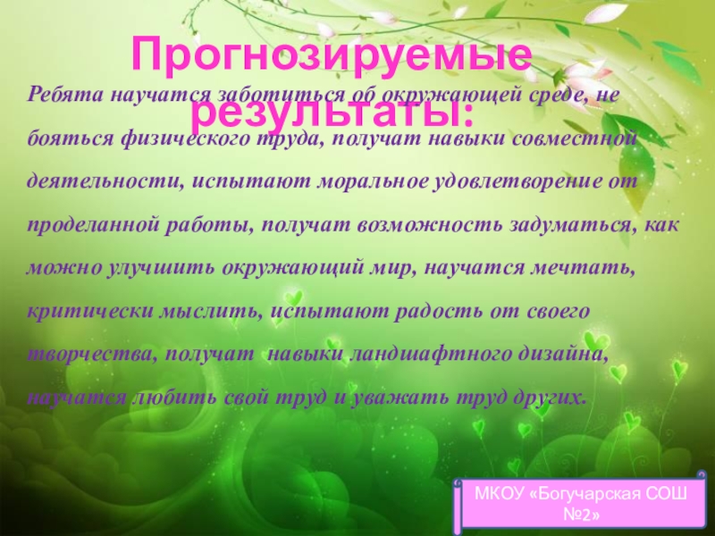 ребята научатся заботиться об окружающей среде, не бояться физического труда, получат навыки совместной деятельности, испытают моральное удовлетворение от проделанной работы.