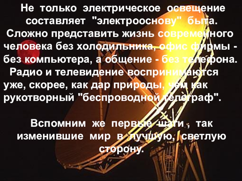 Радио и телевидение воспринимаются уже, скорее, как дар природы, чем как рукотворный "беспроводной телеграф".