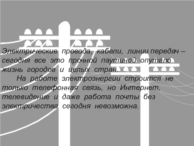На работе электроэнергии строится не только телефонная связь, но Интернет, телевидение и даже работа почты без электричества сегодня невозможна.