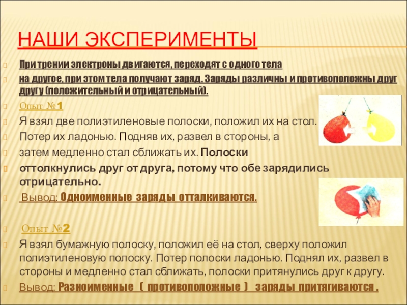 Я взял бумажную полоску, положил её на стол, сверху положил полиэтиленовую полоску. Потер полоски ладонью. Поднял их, развел в стороны и медленно стал сближать, полоски притянулись друг к другу.