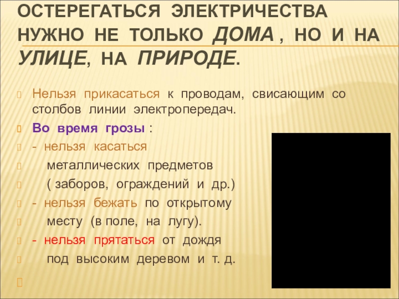 Слайд 58ОСТЕРЕГАТЬСЯ ЭЛЕКТРИЧЕСТВА НУЖНО НЕ ТОЛЬКО ДОМА , НО И НА