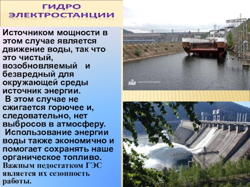 Использование энергии воды также экономично и помогает сохранять наше органическое топливо. Важным недостатком ГЭС является их сезонность работы.