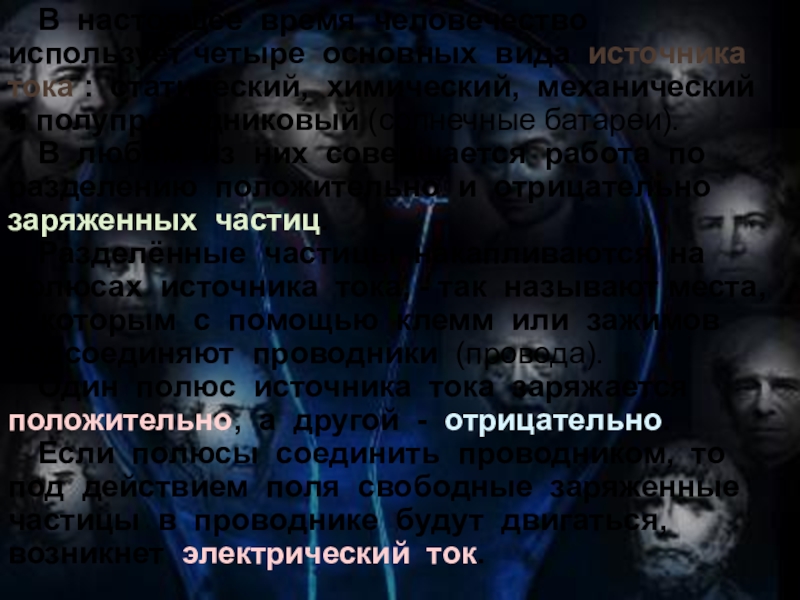 В настоящее время человечество использует четыре основных вида источника тока : статический, химический, механический и полупроводниковый (солнечные батареи).