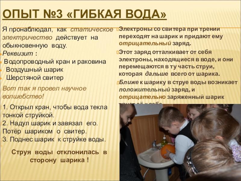 3. Поднес шарик к струйке воды.