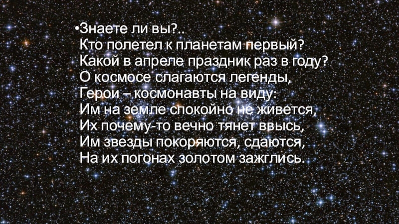 в году? О космосе слагаются легенды, Герои – космонавты на виду: Им на земле спокойно не живется, Их почему-то вечно тянет ввысь, Им звезды покоряются, сдаются, На их погонах золотом зажглись.