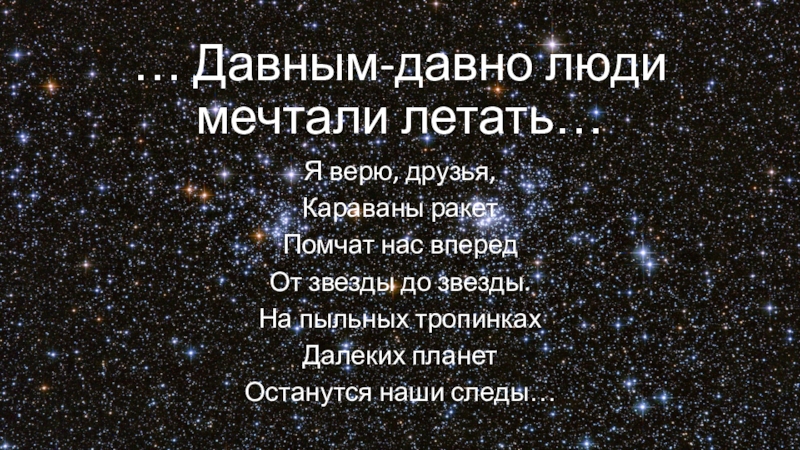 … Давным-давно люди мечтали летать…Я верю, друзья,Караваны ракетПомчат нас впередОт звезды до звезды.На пыльных тропинкахДалеких планетОстанутся наши