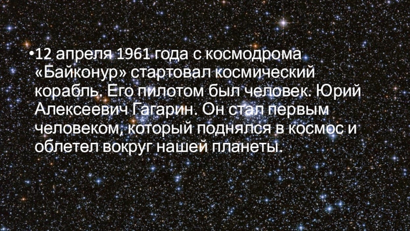 12 апреля 1961 года с космодрома «Байконур» стартовал космический корабль. Его пилотом был человек. Юрий Алексеевич Гагарин.