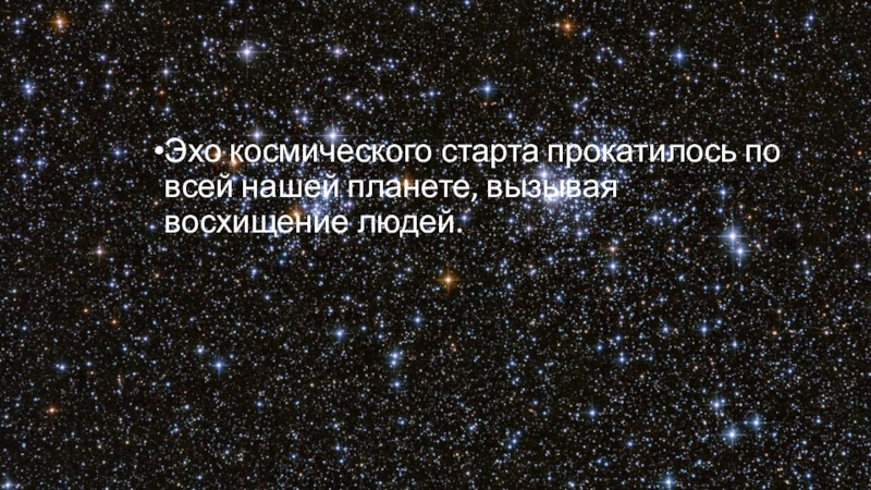 Слайд 17Эхо космического старта прокатилось по всей нашей планете, вызывая восхищение людей.