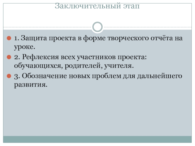 Заключительный этап 1. Защита проекта в форме творческого отчёта на уроке.2. Рефлексия всех участников проекта: обучающихся, родителей,