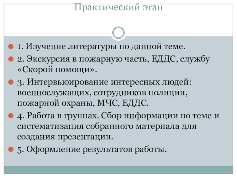 Практический этап 1. Изучение литературы по данной теме.2. Экскурсия в пожарную часть, ЕДДС, службу «Скорой помощи».3. Интервьюирование