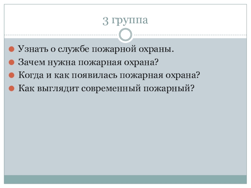 3 группаУзнать о службе пожарной охраны.Зачем нужна пожарная охрана?Когда и как появилась пожарная охрана?Как выглядит современный пожарный?