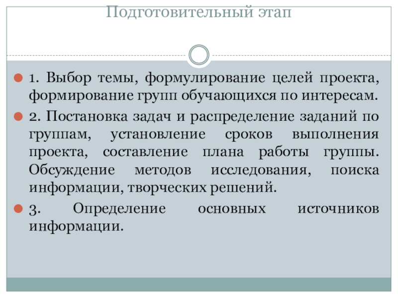 Подготовительный этап 1. Выбор темы, формулирование целей проекта, формирование групп обучающихся по интересам. 2. Постановка задач и распределение заданий по группам, установление сроков выполнения проекта, составление плана работы группы. Обсуждение методов исследования, поиска информации, творческих решений.3.