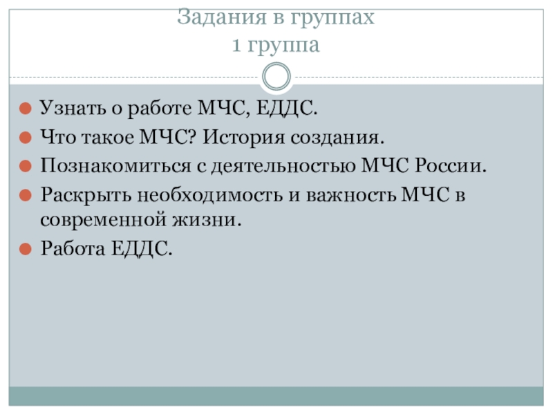 Задания в группах 1 группаУзнать о работе МЧС, ЕДДС.Что такое МЧС? История создания.Познакомиться с деятельностью МЧС России.Раскрыть