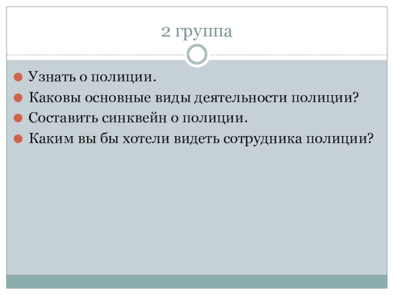 2 группаУзнать о полиции.Каковы основные виды деятельности полиции?Составить синквейн о полиции.Каким вы бы хотели видеть сотрудника полиции?