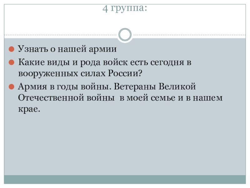 4 группа:  Узнать о нашей армииКакие виды и рода войск есть сегодня в вооруженных силах России?Армия