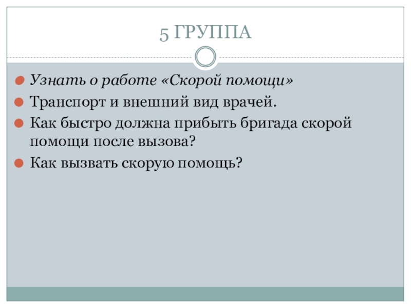 5 ГРУППАУзнать о работе «Скорой помощи»Транспорт и внешний вид врачей.Как быстро должна прибыть бригада скорой помощи после
