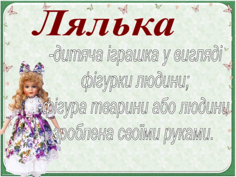 Лялька -дитяча іграшка у вигляді фігурки людини;-фігура тварини або людини зроблена своїми руками.