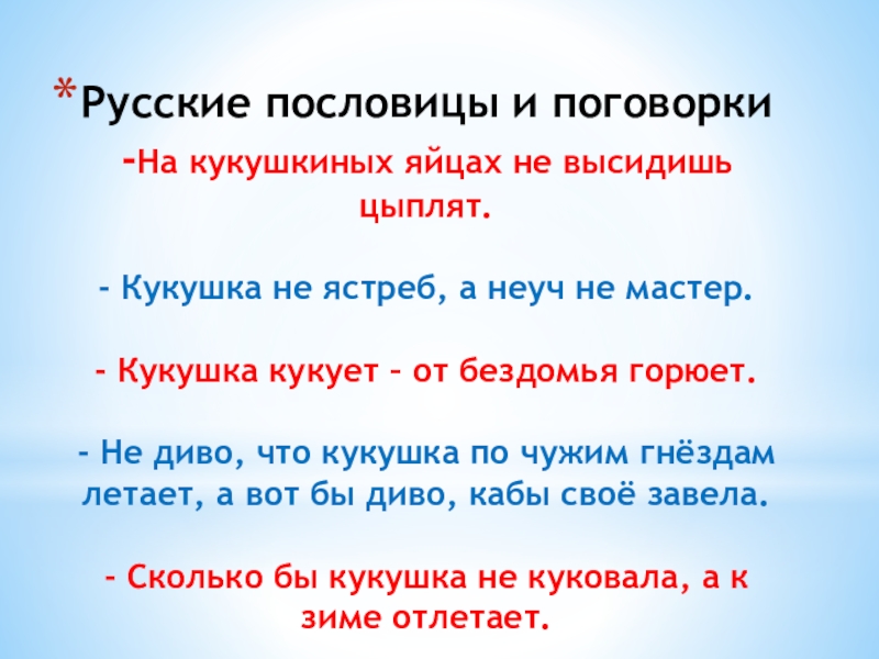 - Сколько бы кукушка не куковала, а к зиме отлетает.