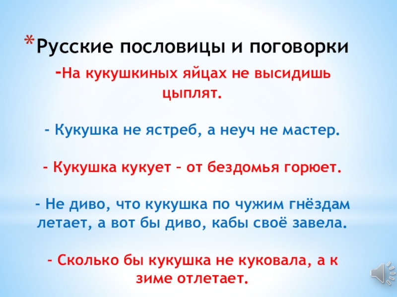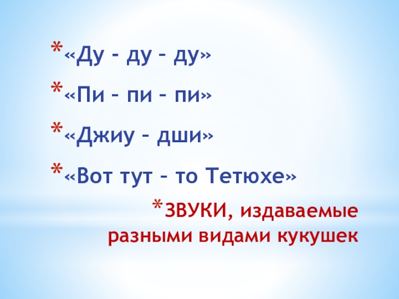 Слайд 20ЗВУКИ, издаваемые разными видами кукушек