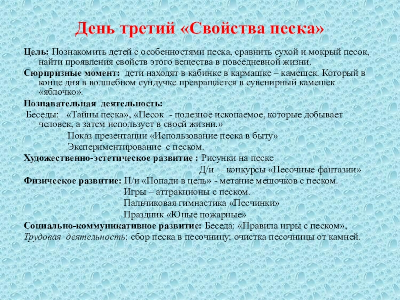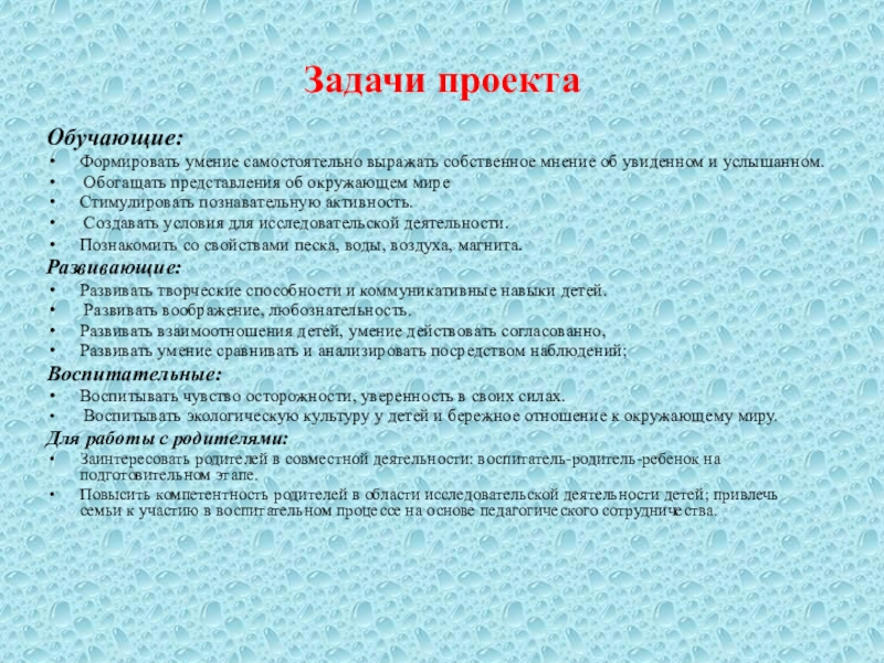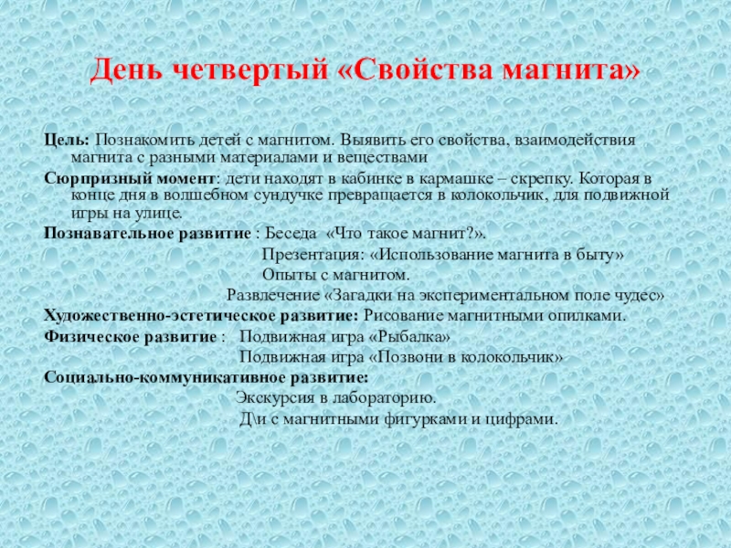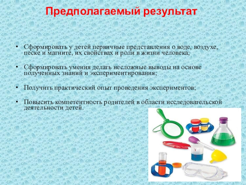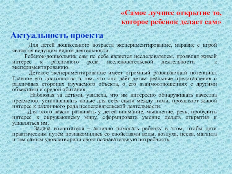 Задача воспитателя – активно помогать ребенку в этом, чтобы дети практическим путём познакомились со свойствами воды, воздуха, песка, магнита и тем самым удовлетворили свою познавательную потребность.