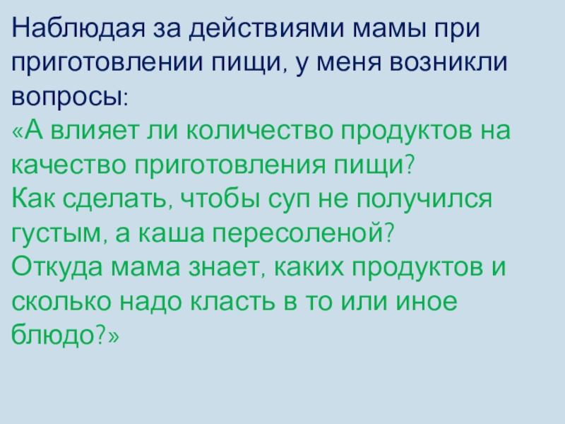 Слайд 20Наблюдая за действиями мамы при приготовлении пищи, у меня возникли вопросы: