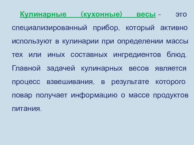 Слайд 12Кулинарные (кухонные) весы - это специализированный прибор, который активно используют в кулинарии