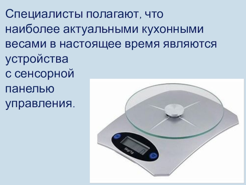 Слайд 16Специалисты полагают, что наиболее актуальными кухонными весами в настоящее время являются