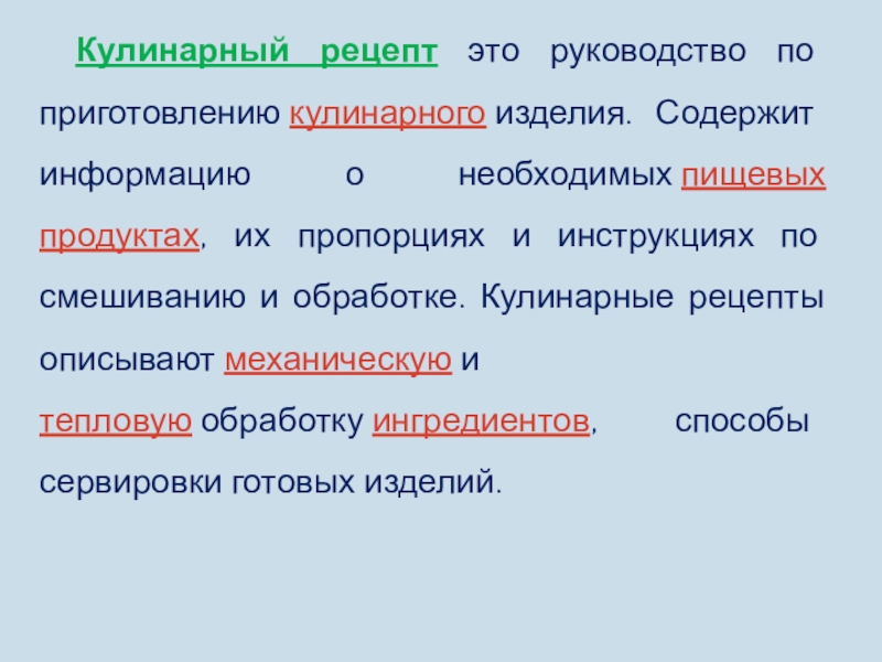 Слайд 17Кулинарный рецепт это руководство по приготовлению кулинарного изделия. Содержит информацию о необходимых пищевых продуктах,