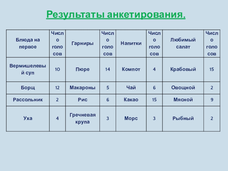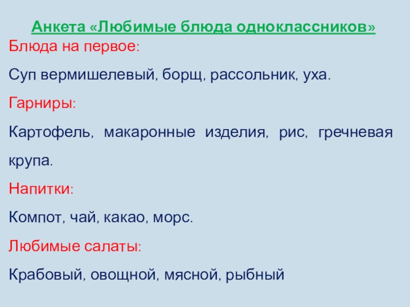 Слайд 32Анкета «Любимые блюда одноклассников»