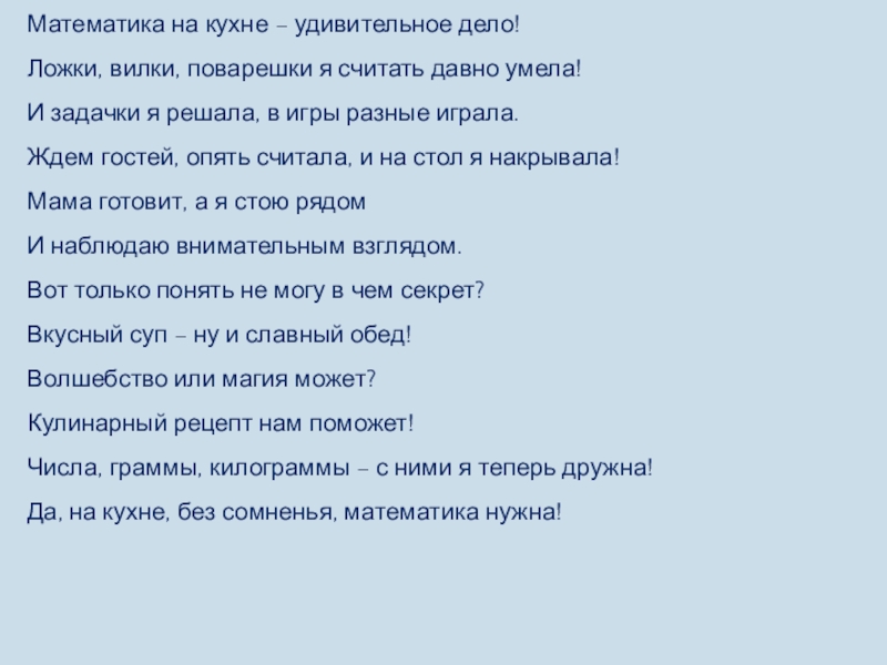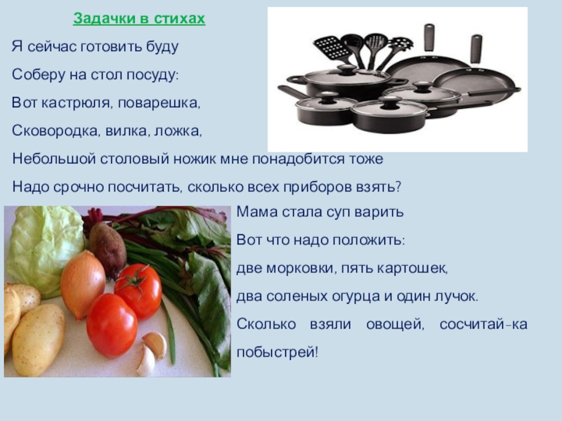 Придумать задачи в стихах, используя продукты питания или кухонные принадлежности.