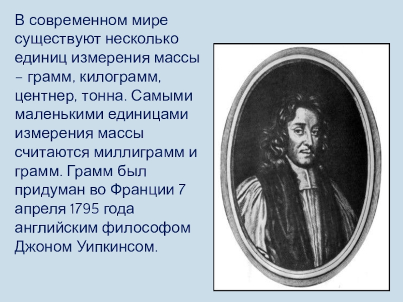 центнер, тонна. Самыми маленькими единицами измерения массы считаются миллиграмм и грамм. Грамм был придуман во Франции 7 апреля 1795 года английским философом Джоном Уипкинсом.